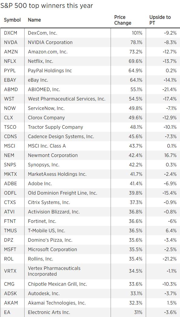 今年标普500指数成份股中的最大赢家是医疗器械公司DexCom(DXCM),该公司股价今年已上涨了101%,主要由第一季度高达980%的每股收益增长而推动。该公司表示,在疫情期间,看到了向远程医疗转移的好处。不过,分析师预计,在未来12个月内,DexCom将从目前水平下跌9%。
