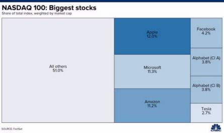 以纳斯达克100指数为例,领头的六支大型科技股――苹果、微软、亚马逊、Alphabet谷歌母公司、Facebook和特斯拉几乎占到了该指数市值的一半。标普500指数等其他大盘指数也都呈现了相同的现象和趋势,显示美股市场窄度持续降低。