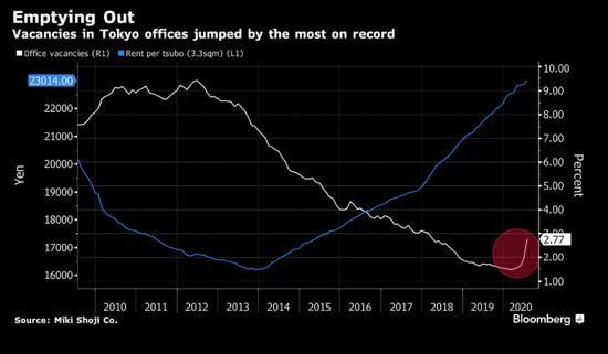 数据发布当天传来了东京地区因新冠疫情破产的公司已达百家的消息。根据三木商事的调查结果,东京中心区域五个主要商务区的写字楼空置率全面上升,其中港区空置率升幅最大,达到了1.19个百分点。