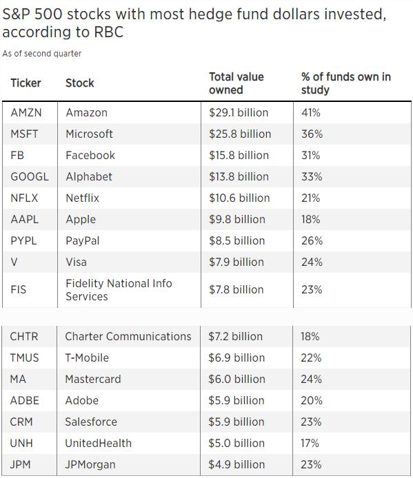 对冲基金同样也喜欢支付公司Mastercard(MA)和Visa(V),这两支股今年分别上涨了12%和8%。此外,Fidelity National Information Services(FIS)和Charter Communications(CHTR)也同样上榜了基金持有最多的股票名单中。