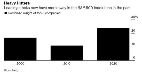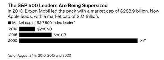 标普500指数中的主要股票现在的权重是十年前的两倍多。如今,苹果占该指数的7.2%,而2010年埃克森美孚(Exxon Mobil Corp.)以约3.2%的比例位居榜首。周一,这家石油和天然气公司被踢出道琼斯工业平均指数,让位于Salesforce.com Inc.等更多科技公司。