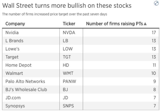 华尔街分析师对L Brands(LB)、Lowe’s(LOW)、Target(TGT)、家得宝(HD)、沃尔玛(WMT)和BJ’s Wholesale Club(BJ)等一系列零售商的立场也变得更为乐观。